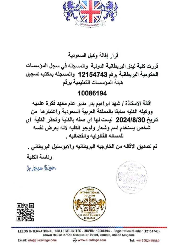 أعلنت كلية ليدز البريطانية الدولية، المسجلة في سجل المؤسسات الحكومية البريطانية برقم 12154743 والمقيدة بمكتب تسجيل هيئة المؤسسات التعليمية برقم 10086194، عن قرارها بإقالة الأستاذة شهد إبراهيم بدر، والتي كانت تشغل منصب مدير عام معهد فكرة علمية ووكيل الكلية السابق في المملكة العربية السعودية.