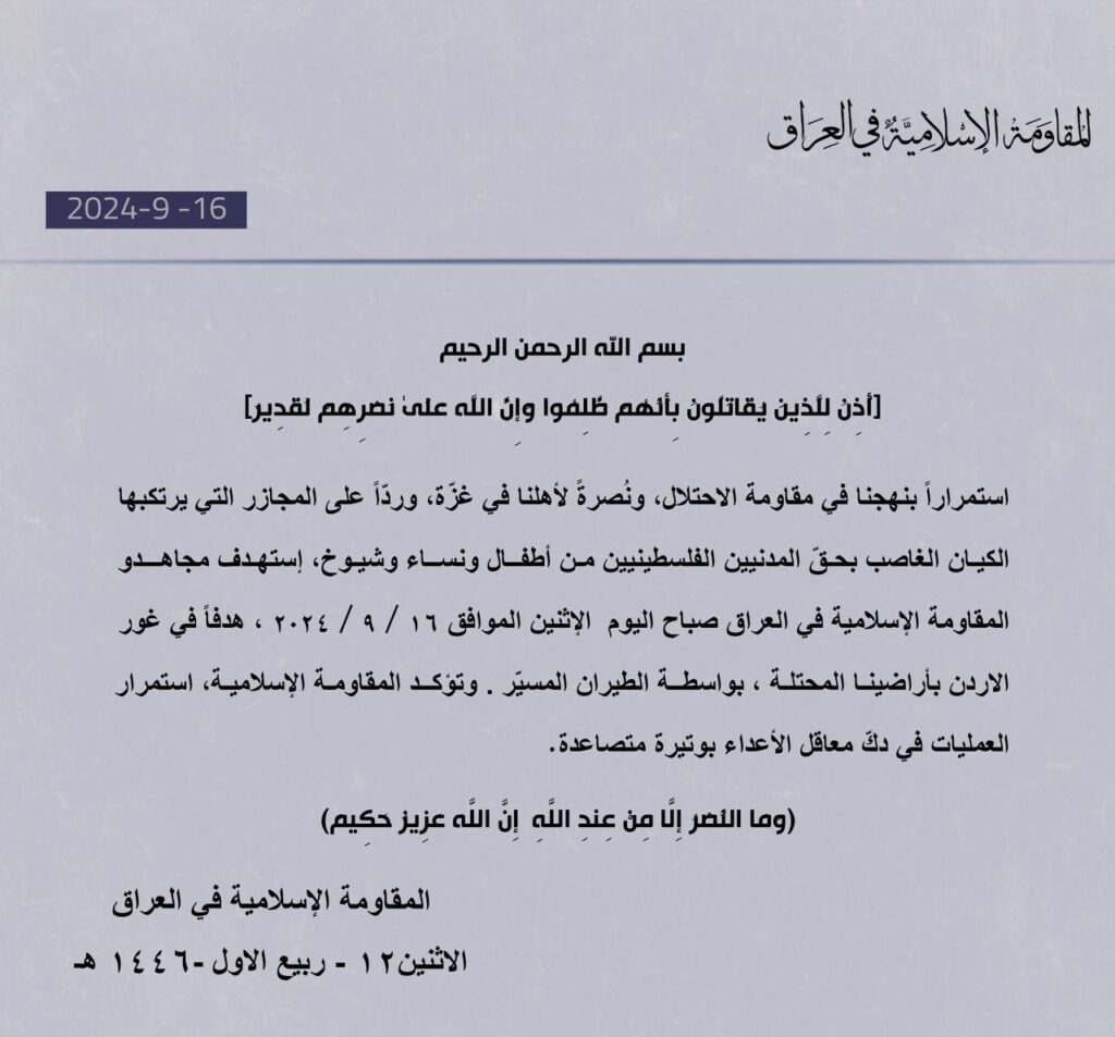 استهدف مجاهدو المقاومة الإسلامية في العراق صباح اليوم الإثنين الموافق 16 / 9 / 2024 ، هدفاً في غور الاردن بأراضينا المحتلة ، بواسطة الطيران المسيّر.
