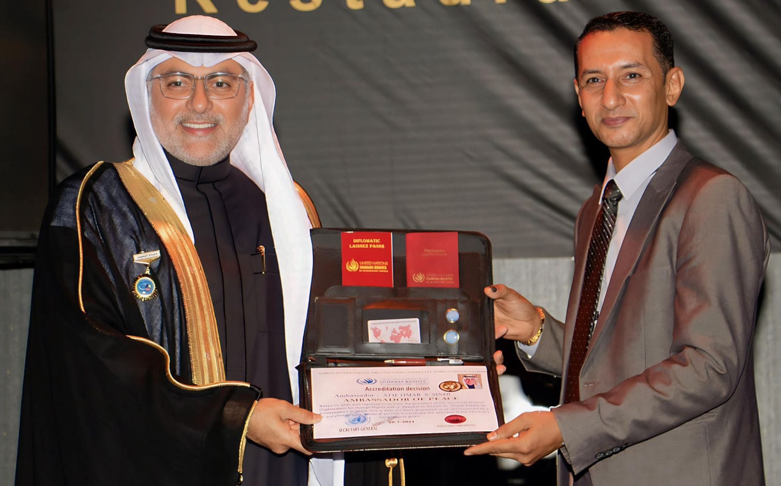 وأقيمت مراسم تكريم رسمية حضرها نخبة من الشخصيات العامة، إلى جانب نجوم الفن والإعلام، حيث تم تسليم عاطف سندي وثائق إعتماده الدبلوماسية تقديرًا لدوره البارز في نشر السلام العالمي وتعزيز حقوق الإنسان والمساواة.