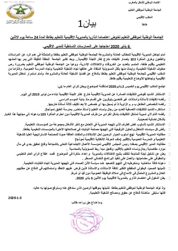 قالت الجامعة الوطنية لموظفي التعليم حسب بلاغ لها انها ستخوض اعتصاما بالمديرية الاقليمية للتعليم بطاطا لمدة 24 ساعة يوم الاثنين 6 يناير 2020 احتجاجا على الممارسات التسلطية للمدير الاقليمي والتي تتجلى في خرق المذكرة 103 باصدار تكليفات خارج اطار اللجنة الاقليمية وكذا عدم الرد عن المراسلات والطعون