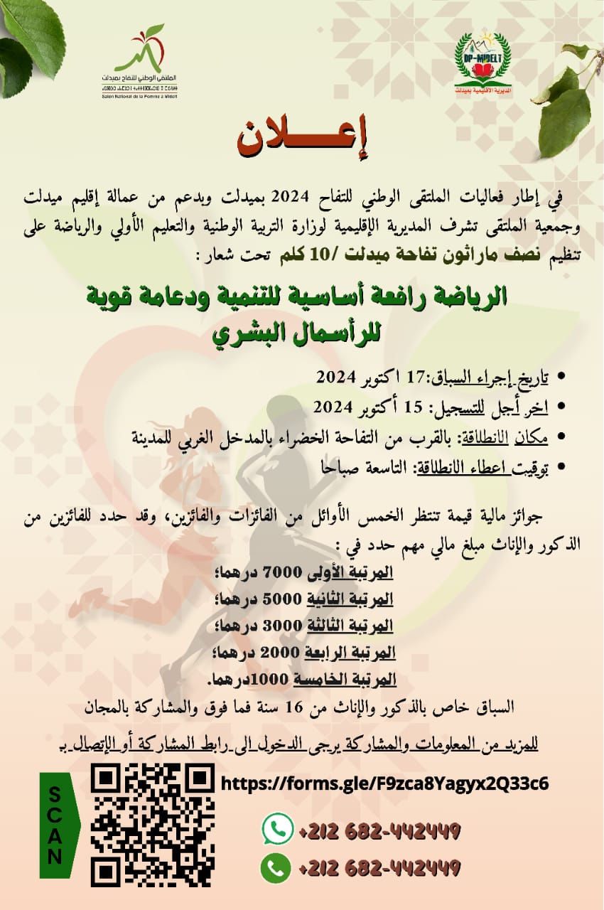 تستعد مدينة ميدلت لاحتضان أول نسخة من نصف ماراتون “تفاحة ميدلت”، في مسافة 10كلم، يوم الخميس 17 أكتوبر الجاري ضمن فعاليات الملتقى الوطني للتفاح.
