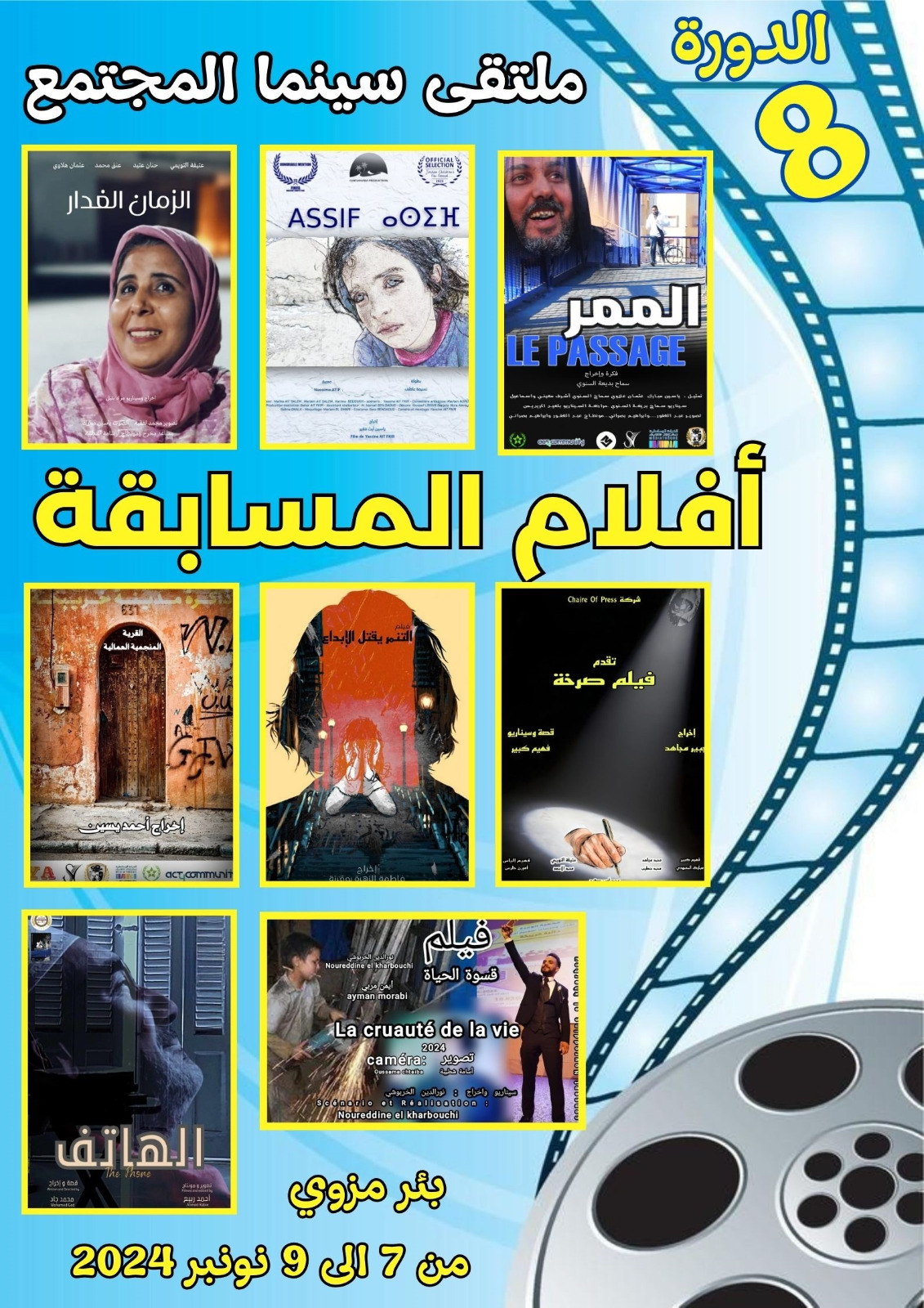 تشارك ثمانية أفلام قصيرة في المسابقة الرسمية لملتقى سينما المجتمع “دورة الممثل المقتدر ربيع القاطي”، الذي تنظمه جمعية الشروق ببئر مزوي، إقليم خريبكة، في الفترة من 7 إلى 9 نونبر 2024.