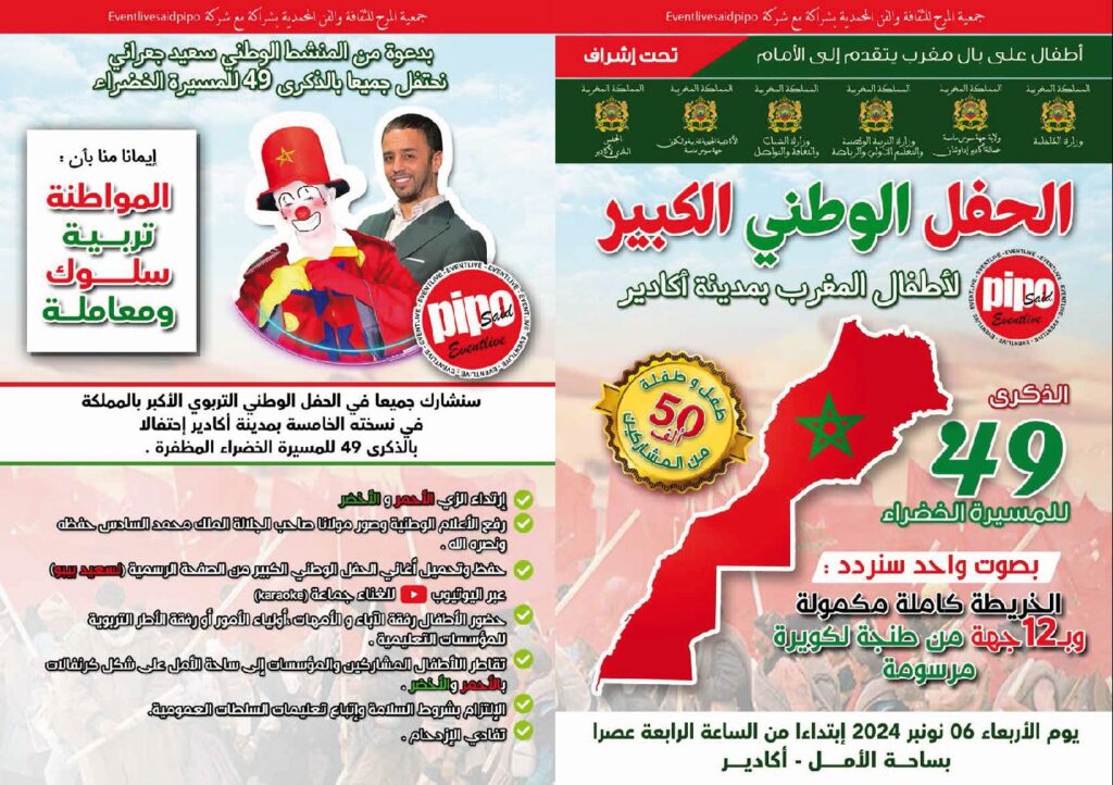في إطار فعاليات قافلة المواطنة وتحت شعار “الخريطة كاملة مكمولة و بـ 12 جهة من طنجة للݣويرة مرسومة”، تستعد مدينة أكادير لاستقبال أضخم احتفالية وطنية، بمناسبة الذكرى 49 للمسيرة الخضراء، بتأطير من المنشط الوطني سعيد بيبو، وذلك يوم الأربعاء 06 نونبر 2024، ابتداءً من الساعة الثالثة زوالًا بساحة الأمل.