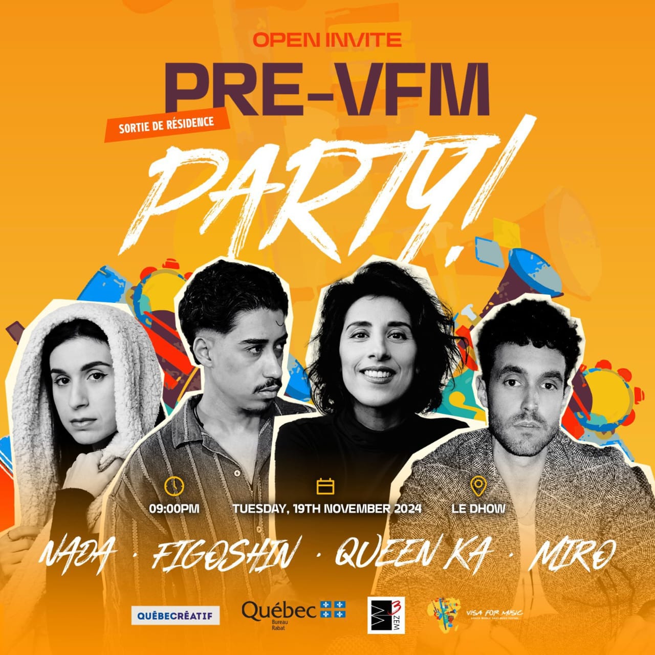 ويتضمن برنامج الفعاليات في الدار البيضاء إقامة فنية تضم أربعة من أبرز الفنانين المغاربة والكيبيكيين، حيث سيشاركون في جلسات تأليف وكتابة موسيقية مشتركة، يشارك فيها من المغرب مغني الراب الشاب Figoshin، وفنانة البوب Nada. ومن جانب كيبيك، ستشارك الفنانة Queen Ka، والملحن Miro. وسيُختتم هذا التعاون الفني في أمسية خاصة يوم 19 نوفمبر في فضاء Dhow بالرباط، حيث سيُقدم فيها الفنانون المشاركون أعمالهم الفنية المشتركة.