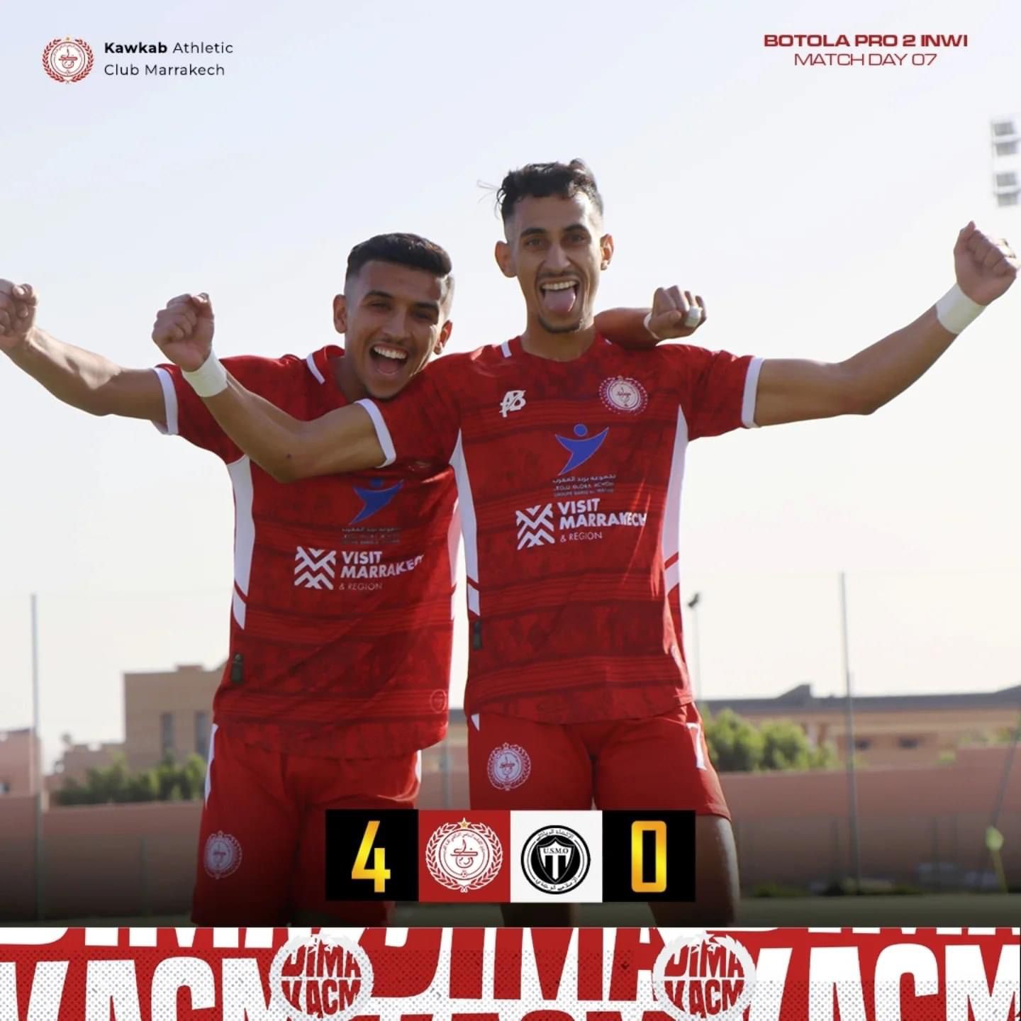 الكوكب المراكشي واصل زحفه نحو المقدمة بعد فوز ساحق على ضيفه الاتحاد الإسلامي الوجدي بأربعة أهداف نظيفة (4-0)، ليصعد إلى المركز السابع برصيد 10 نقاط، بفارق 6 نقاط فقط عن الصدارة.