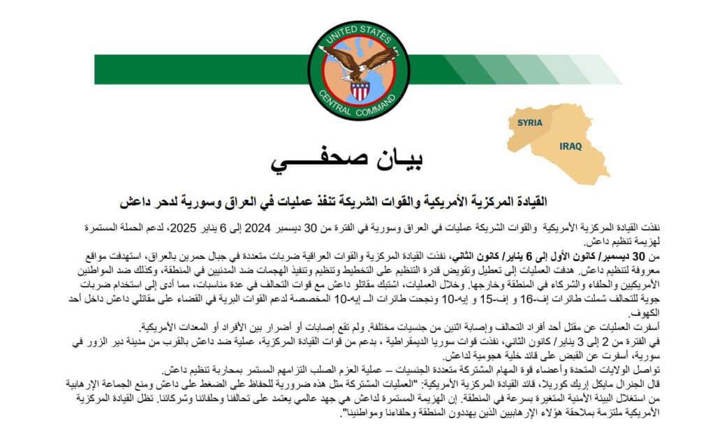 وفي بيان لها تحصل موقع دنا بريس على نسخة منه، قالت القيادة المركزية الأمريكية (سنتكوم) إنها نفذت مع القوات الشريكة عمليات في العراق وسوريا في الفترة من 30 ديسمبر 2024 إلى 6 يناير 2025،” لدعم الحملة المستمرة لهزيمة داعش”.