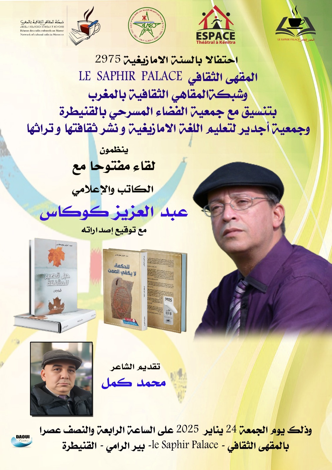 ينظم المقهى الثقافي “Le Saphir Palace” بشراكة مع شبكة المقاهي الثقافية بالمغرب، وبالتنسيق مع جمعية الفضاء المسرحي بالقنيطرة وجمعية أجدير لتعليم اللغة الأمازيغية ونشر ثقافتها وتراثها، بمناسبة السنة الأمازيغية 2975، لقاءً مفتوحًا مع الكاتب والإعلامي عبد العزيز كوكاس، اللقاء الذي سيقدمه الشاعر محمد كمل، حوار مفتوحا للجمهور والفاعلين المهتمين بالحقل الإعلامي والإبداعي والثقافي عامة مع اسم فرض تميزه أسلوبا وممارسة في الحقل الإعلامي وفي حقل الكتابة الإبداعية المتنوعة، وسيشهد توقيع إصدارات الكاتب بما فيها كتابه الحديث الصدور “للحكمة لا يكفي الصمت” و”حبل قصير للمشنقة”،. يُعقد اللقاء يوم الجمعة 24 يناير 2025، ابتداءً من الساعة الرابعة والنصف مساءً، في المقهى الثقافي “Le Saphir Palace”، الكائن في بير الرامي بمدينة القنيطرة.