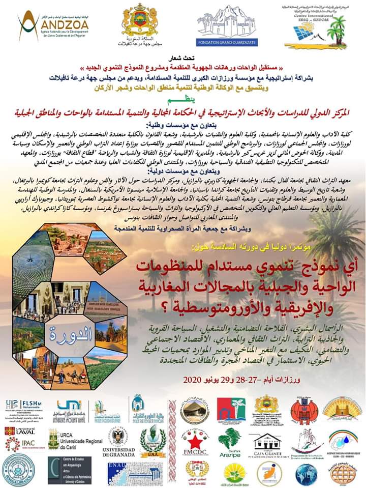 ينظم المركز الدولي للدراسات والأبحاث الإستراتيجية في الحكامة المجالية والتنمية المستدامة بالواحات والمناطق الجبلية، ينظم مؤتمرا دوليا في دورته السادسة حول: “أي نموذج تنموي مستدام للمنظومات الواحية والجبلية بالمجالات المغاربية والإفريقية والأورومتوسطية؟”، في دورته السادسة بعروس الجنوب، مدينة ورزازات، وذلك أيام 27-28 و29 يونيو 2020.