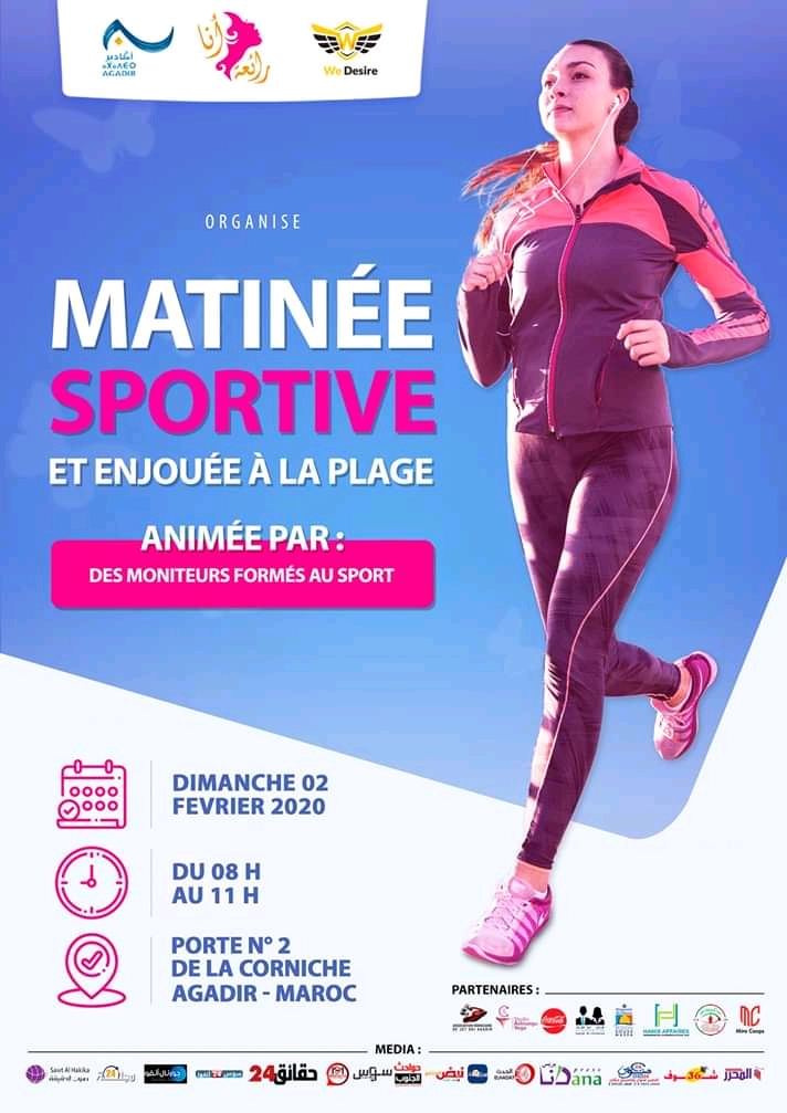مبادرة أنا رائعة ستشرف على صبحية رياضية تتضمن عدة فقرات متنوعة تتخللها رقصات موسيقية…، وذلك يوم الاحد 02 فبراير 2020 على الساعة 08 صباحا بالمدخل رقم 2 كورنيش أكادير.