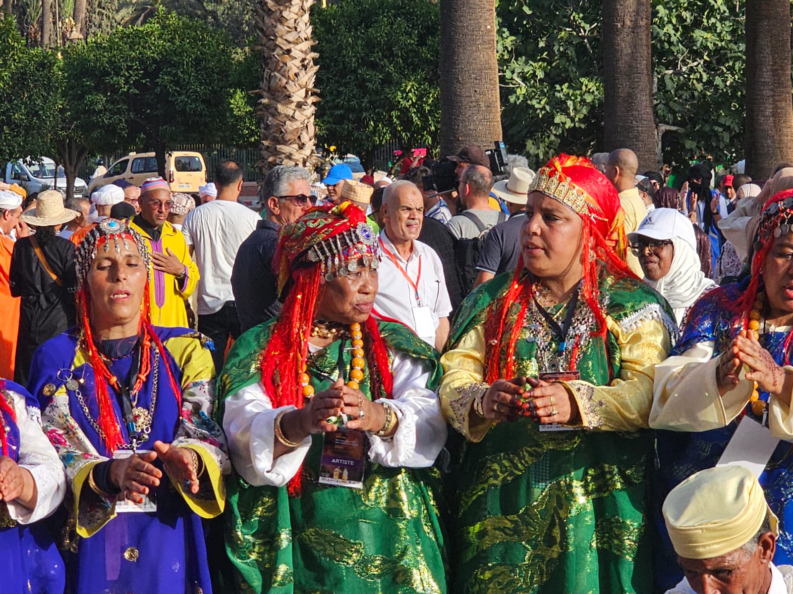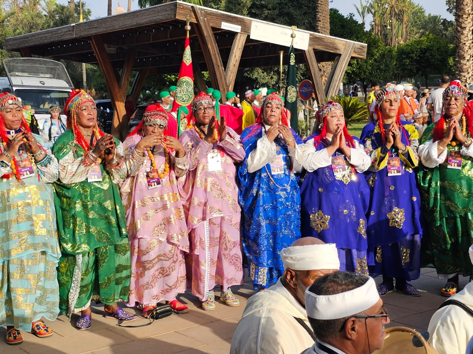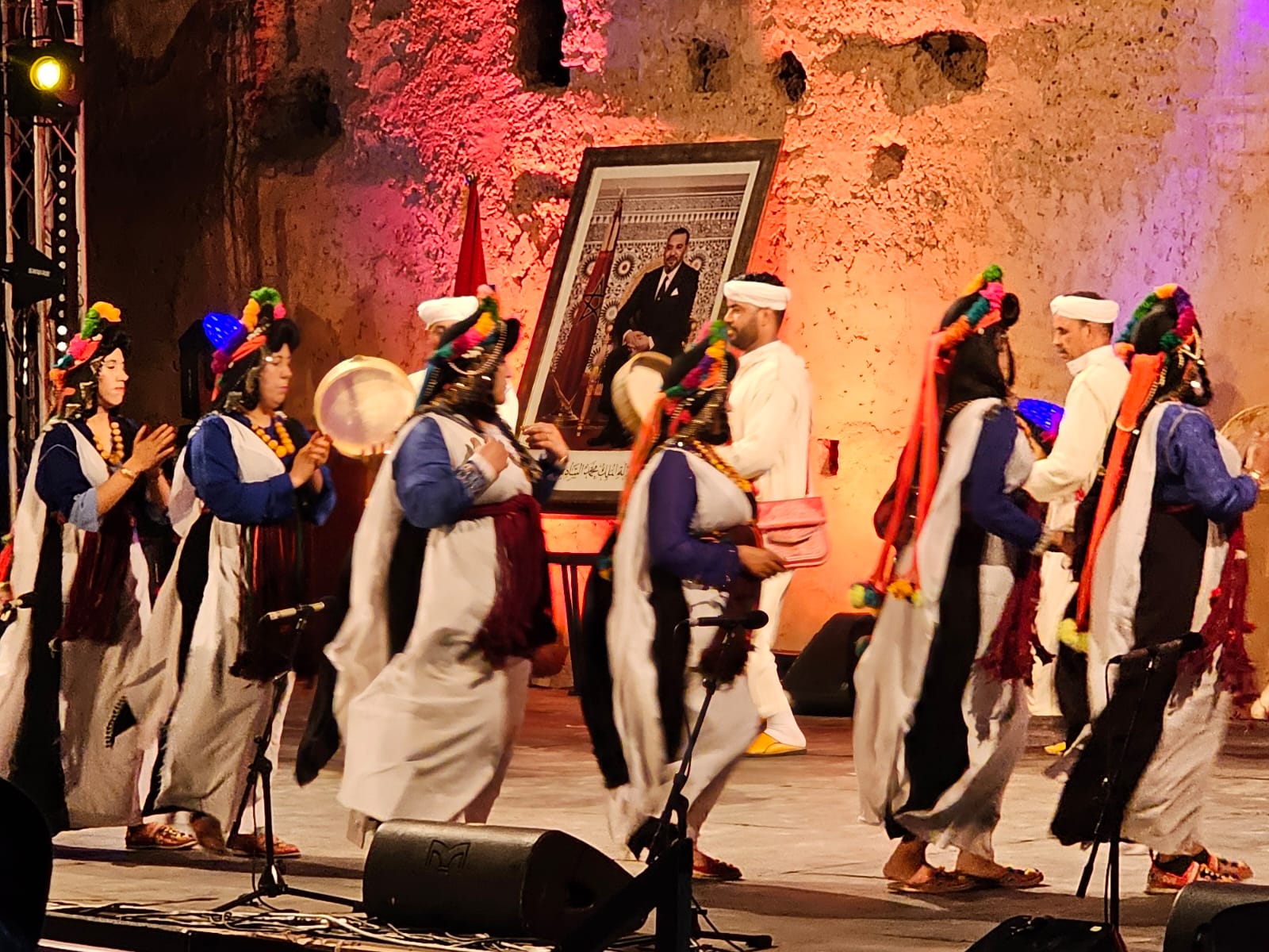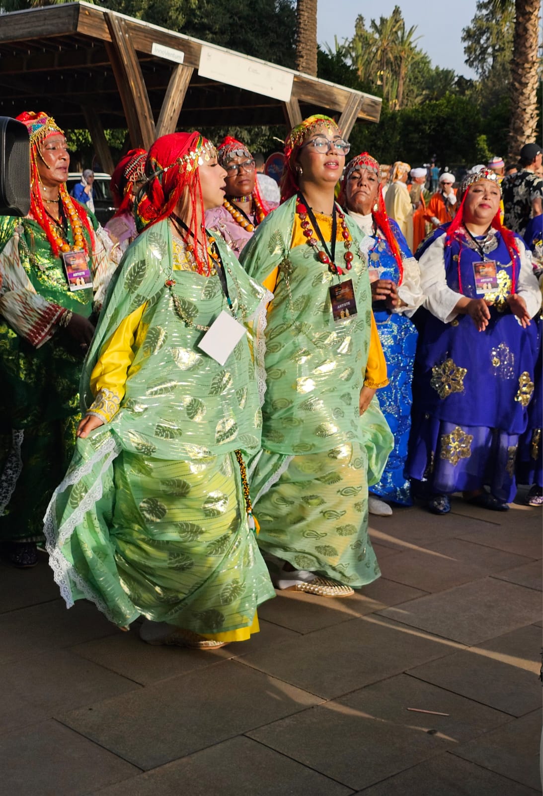 تراءت الفرق وكأنها طيور زاجلة ولكل سربة طقوسها والتي يشكل الزي أحد مكوناتها الرئيسية، والتي ايضا؛ تمثل انتماء وهوية كل فرقة عن الأخرى، الجلباب الأبيض للرجال، والبزيوية كذلك والسوسية حاضرة والدراعية الصحراوية كذلك، قمصان وملاحف مُزركشة للنساء، مضاف إليها إكسسوارات وحلي محلية، تعكس ذاك الغنى المبهر للمملكة.
