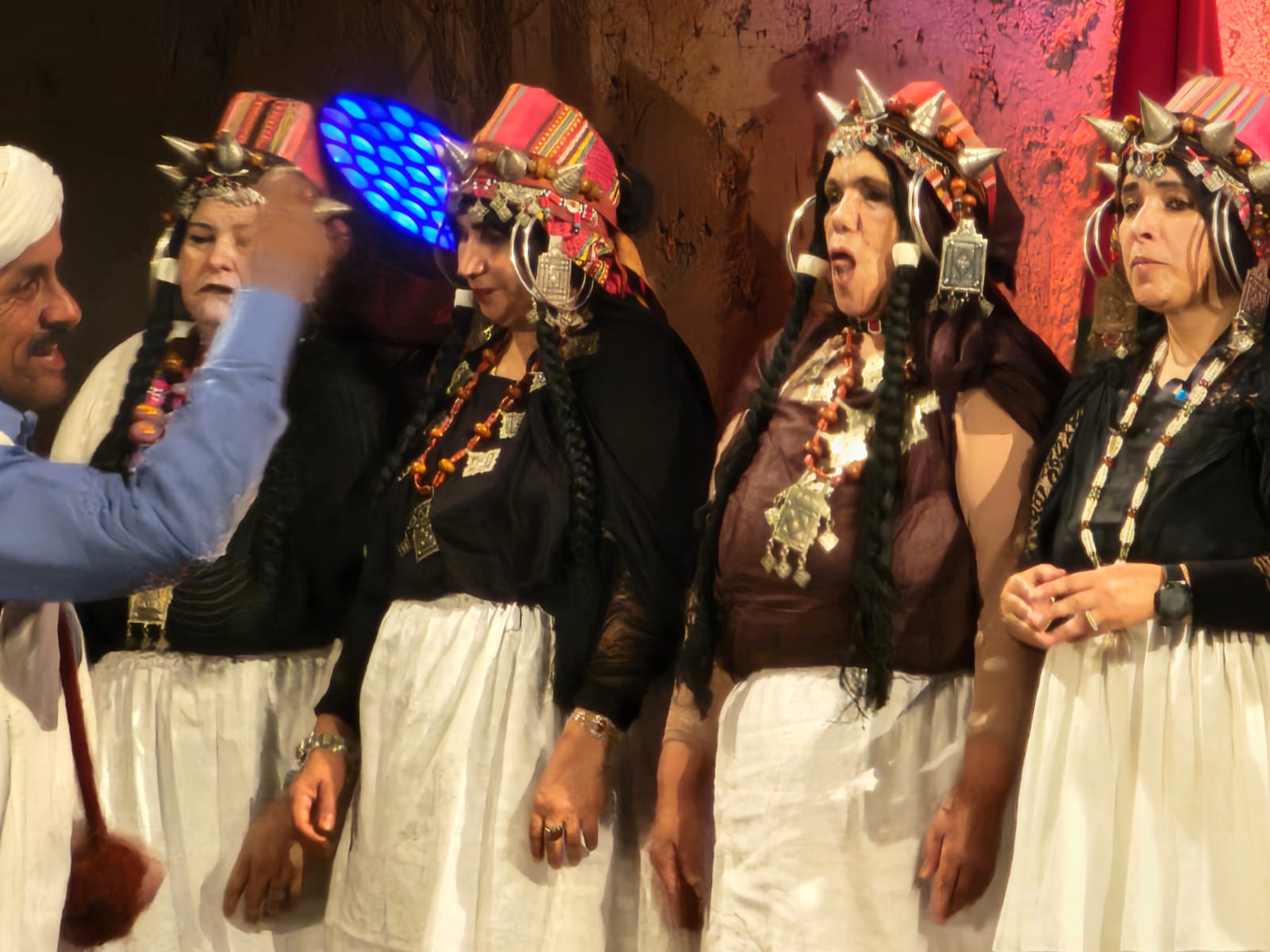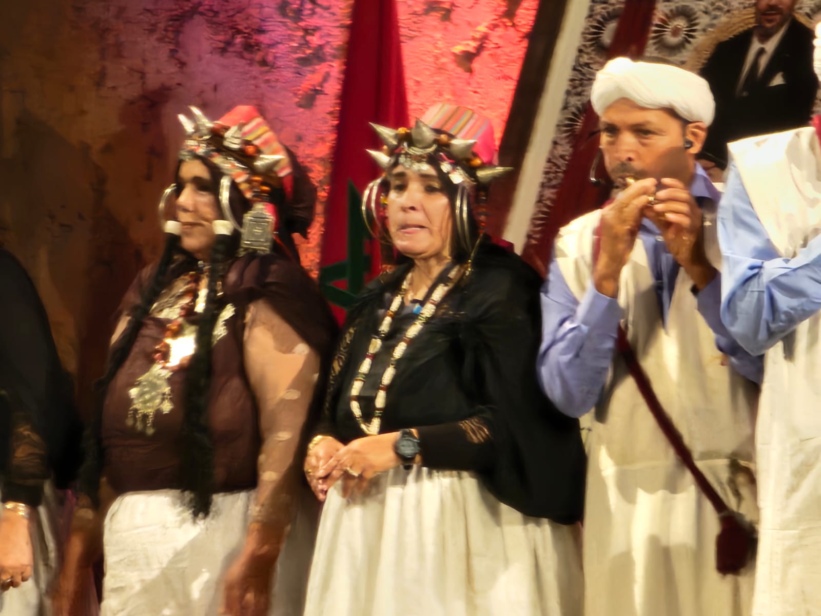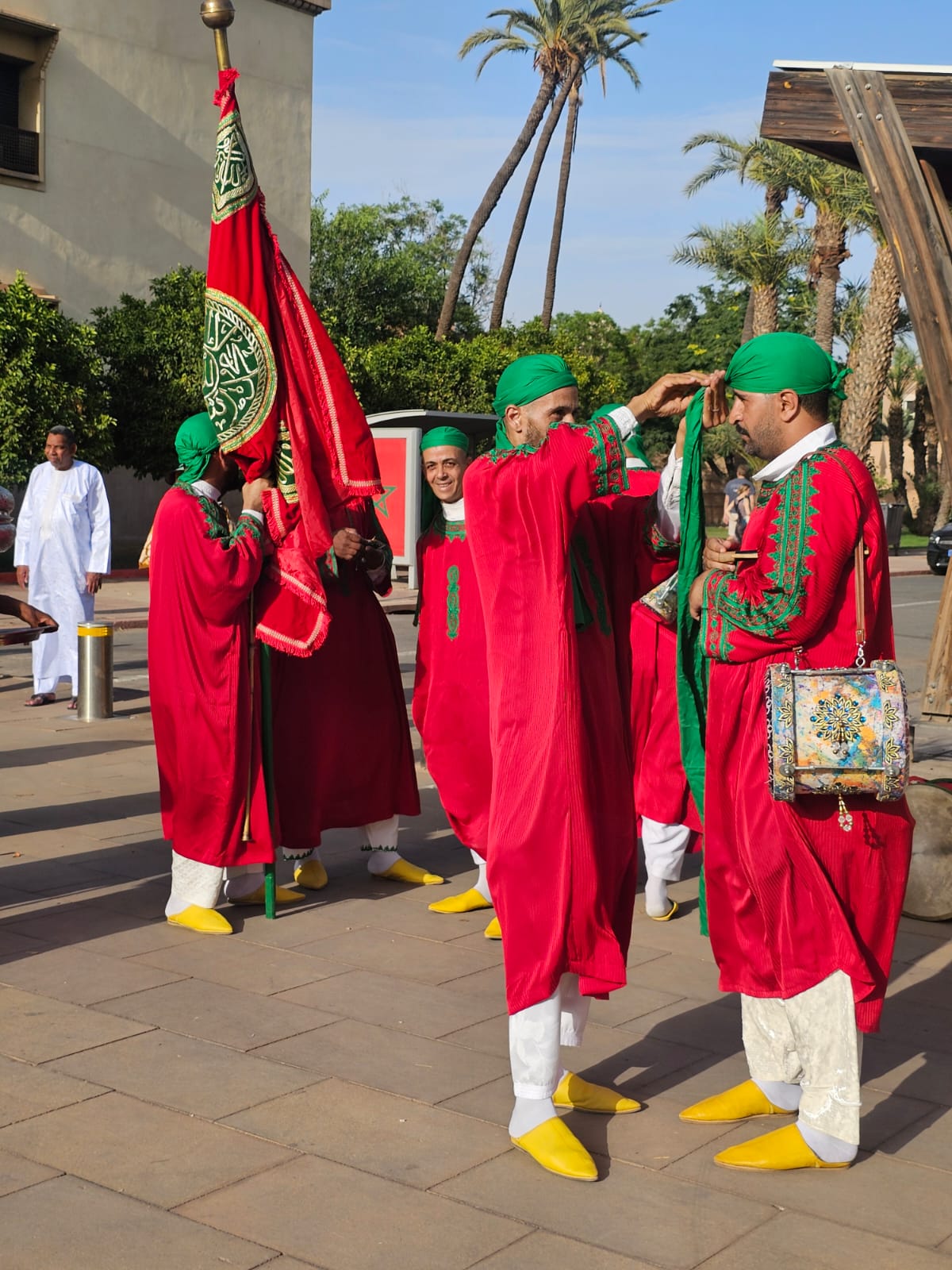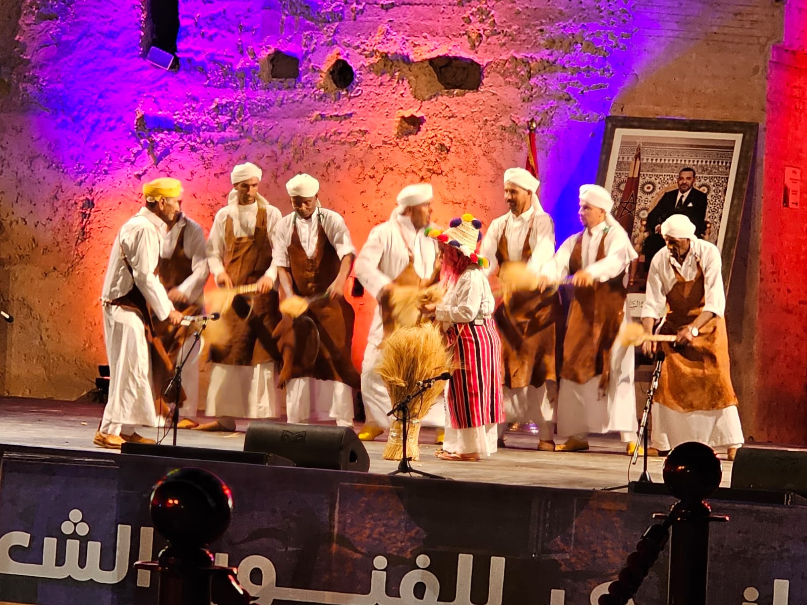 تراءت الفرق وكأنها طيور زاجلة ولكل سربة طقوسها والتي يشكل الزي أحد مكوناتها الرئيسية، والتي ايضا؛ تمثل انتماء وهوية كل فرقة عن الأخرى، الجلباب الأبيض للرجال، والبزيوية كذلك والسوسية حاضرة والدراعية الصحراوية كذلك، قمصان وملاحف مُزركشة للنساء، مضاف إليها إكسسوارات وحلي محلية، تعكس ذاك الغنى المبهر للمملكة.