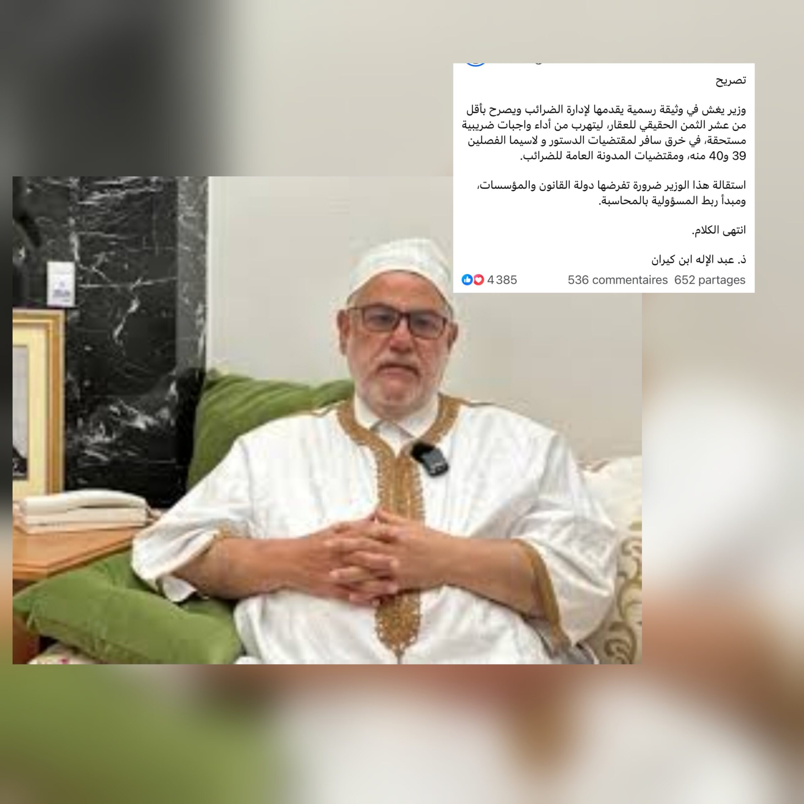 وجاء في تصريح نشره بنكيران على صفحته الرسمية: “وزير يغش في وثيقة رسمية يقدمها لإدارة الضرائب، ويصرح بأقل من عشر الثمن الحقيقي للعقار، ليتهرب من أداء واجبات ضريبية مستحقة، في خرق سافر لمقتضيات الدستور، ولاسيما الفصلين 39 و40 منه، ومقتضيات المدونة العامة للضرائب.”