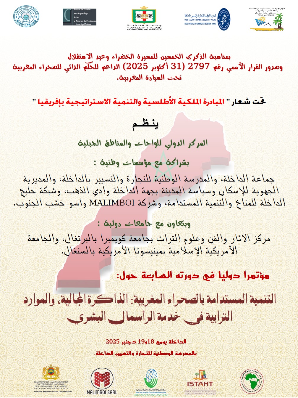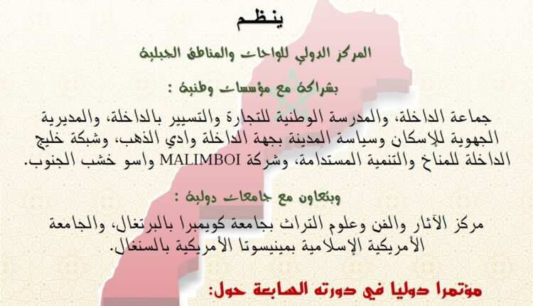 في سياق صدور القرار الأممي رقم 2797، الداعم لمبادرة الحكم الذاتي للصحراء المغربية تحت السيادة المغربية، وبمناسبة الذكرى الخمسين للمسيرة الخضراء المظفرة وعيد الاستقلال المجيد، ينظم المركز الدولي للواحات والمناطق الجبلية مؤتمره الدولي في دورته السابعة، وذلك يومي 18 و19 دجنبر 2025 برحاب المدرسة الوطنية للتجارة والتسيير بمدينة الداخلة.