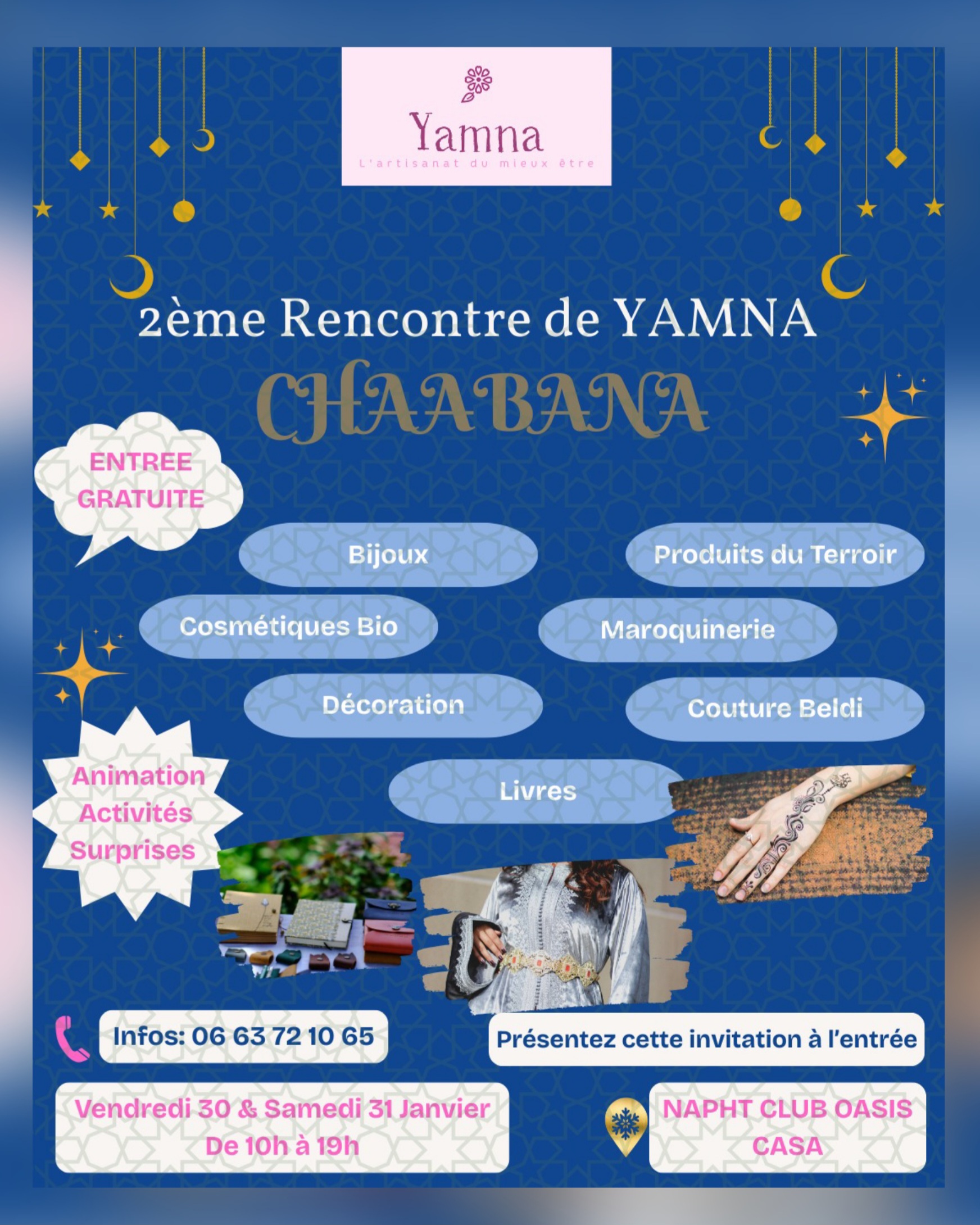 تنظم مبادرة “يامنا – الحرف من أجل العيش الكريم” لقاءً حرفياً خاصاً تحت اسم “لقاء شعبانة”، وذلك يومي الجمعة والسبت 30 و31 يناير 2026 بنادي أهل النفط في حي الوازيس بالدار البيضاء.