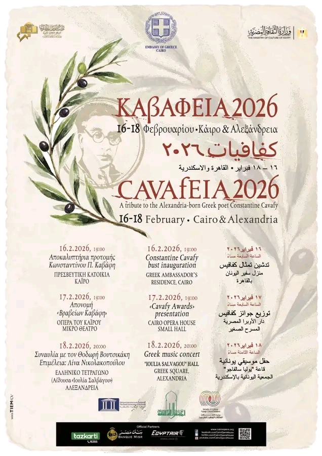 وقد وجهت السفارة الدعوة لأبناء الجالية اليونانية في مصر، والشعب المصري المحب للثقافة اليونانية، لحضور فعاليات “كفافيات” من يوم 16 إلى 18 فبراير. ويتضمن برنامج الفعاليات تدشين تمثال “كفافيس” وذلك بمنزل السفير اليوناني في القاهرة، وتستضيف دار الأوبرا المصرية حفل توزيع جوائز “كفافيس”، وتختتم الفعاليات بحفل موسيقى يونانية في الجمعية اليونانية بالإسكندرية.