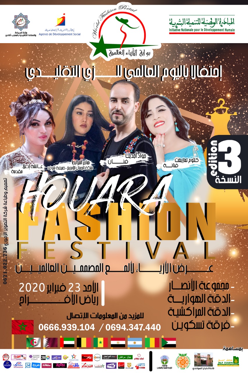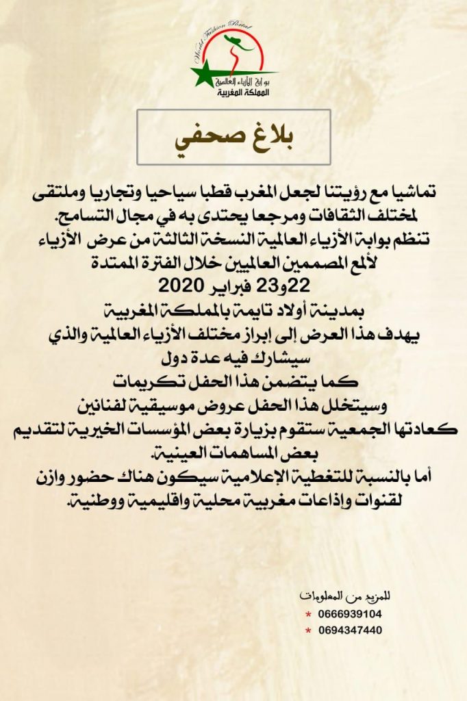 أعلنت بوابة الأزياء العالمية تنظيم النسخة الثالثة من عرض الأزياء لألمع المصممين العالميين، وذلك خلال الفترة الممتدة بين 22 و23 فبراير 2020 بمدينة اولاد تايمة وسيعرف هذا الملتقى تنظيم عرض لمختلف الازياء العالمية.
