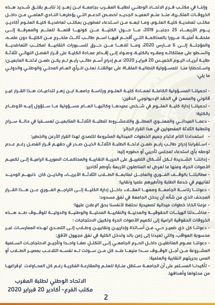 وبهذا القرار ينضاف إلى إحالة ثلاثة طلاب أمام محكمة أكادير على خلفية نشاطهم النقابي، من بينهم عبد اللطيف الغازي، (ينضاف) انتهاك حقوقي جديد من قبل الجامعة طال طالباً رابعاً وهو محمد الحميد، دون توضيح رسمي لأسباب هذا الفصل، ودون سابق إنذار.