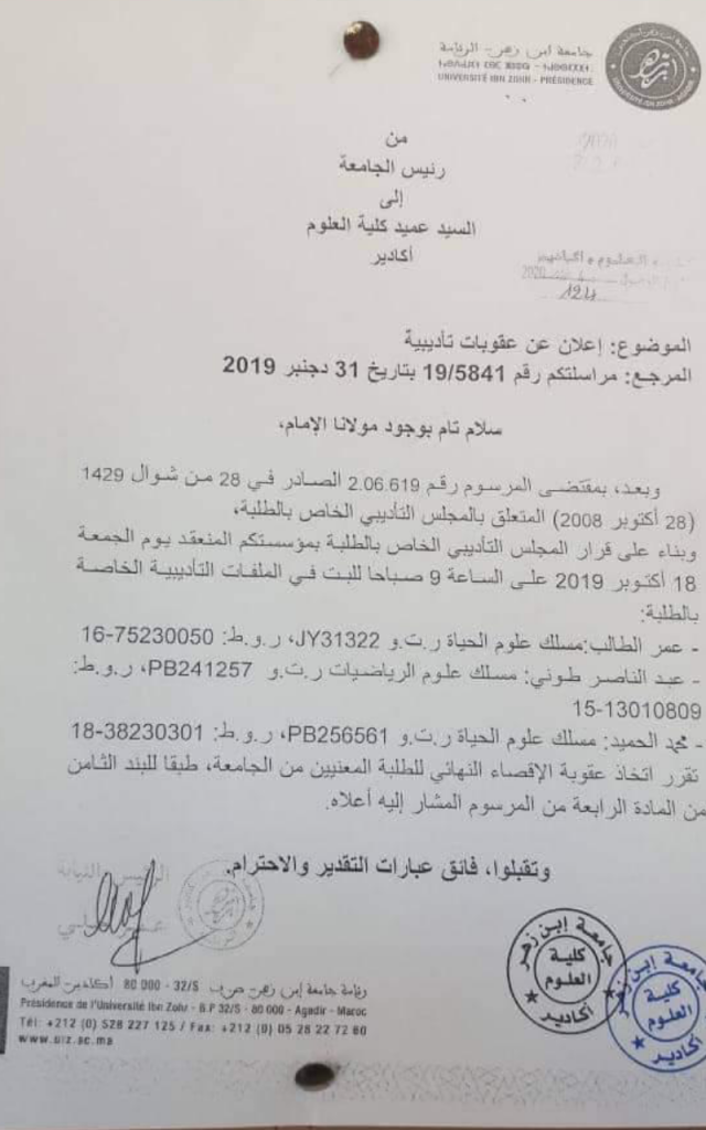 رئاسة جامعة ابن زهر أكادير .. تتخد قرار الطرد النهائي في حق ثلاثة طلبة(بيان)