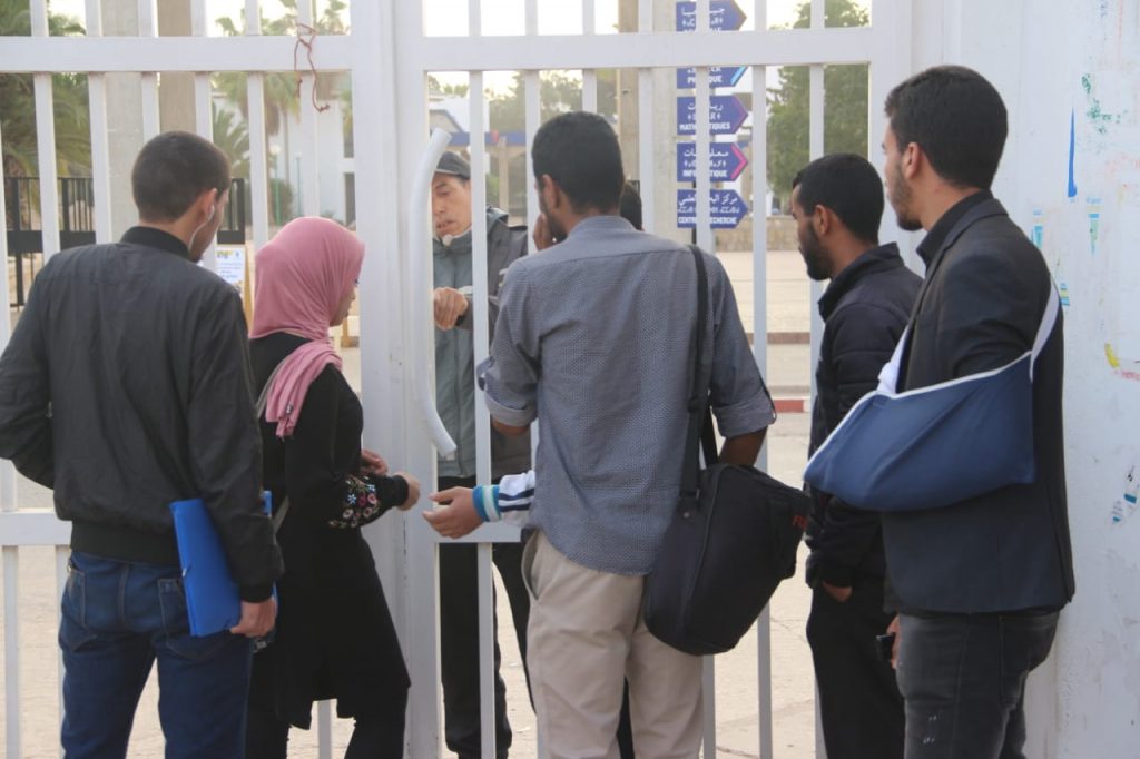وهَمّ هذا المنع، الذي عاينته الجريدة، الطلبة المطرودين في بداية الأمر ليعمم على جميع الطلاب الذين اضطروا للقفز من على سياج المؤسسة ليحضروا لحصصهم، كما طال المنع المتضامنين مع زملائهم المطرودين والمطالبين بعودتهم لمقاعد الدراسة، وتعدى ذلك ليلحق الأساتذة في ثاني أيامه، صباح اليوم السبت 7 مارس الجاري، هدفه، حسب كلمة كاتب فرع أوطم، “فرملة”، الاحتجاجات التي تعرفها الكلية للأسبوع الثالث على التوالي منذ صدور قرار الطرد في قي الطلبة الثلاث.