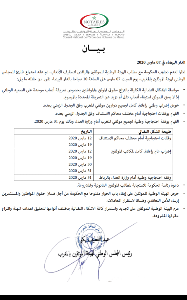 - القيام بوقفة احتجاجية وطنية لجميع موثقي المغرب أمام وزارة العدل وذلك يوم 31 مارس 2020.