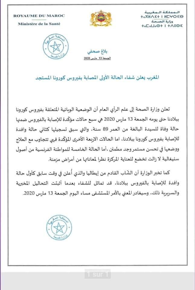 أعلنت وزارة الصحة في بلاغ لها ان الشّاب المغربي القادم من الديار الإيطالية والذي عد في وقت سابق كأول حالة إصابة بفيروس كورونا المستجد تفد على المغرب، قد تماثل للشفاء بعدما أثبتت التحاليل المخبرية والسريرية ذلك، و عليه سيغادر المستشفى مساء اليوم الجمعة .