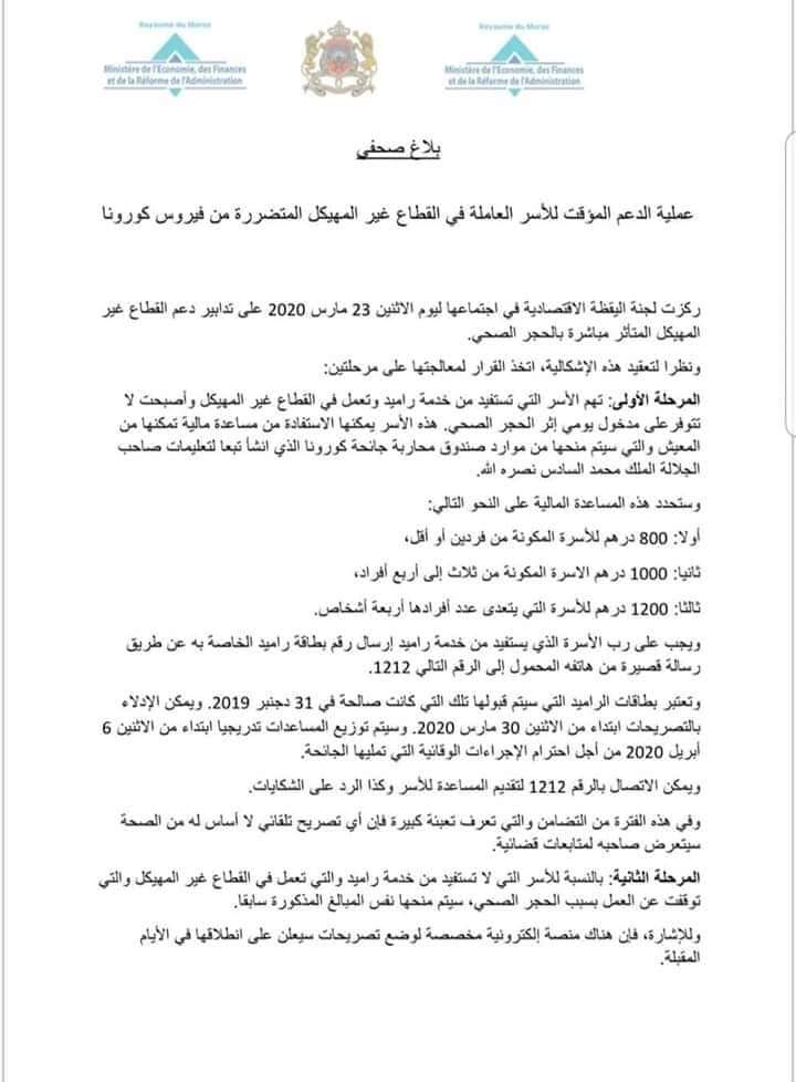 وأوضح البلاغ أنه يمكن الإدلاء بالتصريحات ابتداء من الاثنين 30 مارس 2020، و حددت الوزارة يوم الاثنين 6 أبريل 2020 كموعد لانطلاق توزيع المساعدات تدريجيا من أجل احترام الإجراءات الوقائية التي تمليها الجائحة.