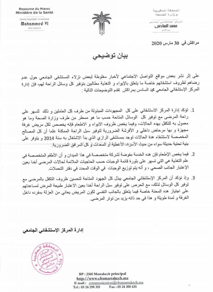 أكد المركز الاستشفائي الجامعي محمد السادس بمراكش، يوم أمس الاثنين، أنه ردا على تصريحات بعض نزلاء المستشفى المصابين بفيروس كوفيد 19، في بيان توضيحي توصلت به جريدتنا دنا بريس، على انه أي المركز الاستشفائي الجامعي محمد السادس، يبذل كل الجهود المتاحة لتحسين ظروف التكفل بالمرضى مع توفير كل الوسائل وسبل الراحة لهم.