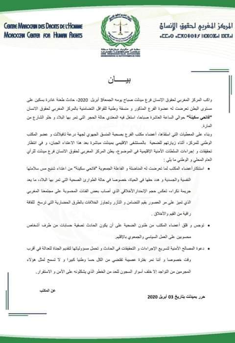 المركز المغربي لحقوق الإنسان فرع ميدلت.. يستنكر الاعتداء على سكينة فاتحي