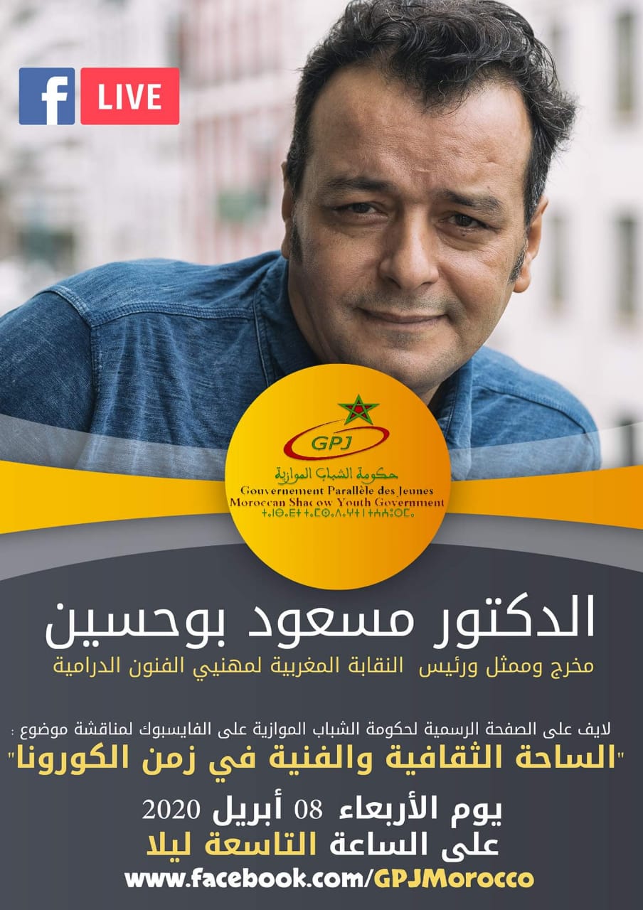 في إطار المبادرة التي تقوم بها حكومة الشباب الموازية، لتبادل الآراء وتقديم عروض حول موضوع جائحة كورونا التي يعيش العالم تحت وطأتها ، والتي نتمنى أن نتجاوزها بسلام ، تلقى الدكتور مسعود بوحسين نقيب الفنانين المغاربة دعوة للتطرق لموضوع – تأثير الحجر الصحي على الفن والفنـانين المغاربة – وذلك الأربعاء المنصرم، على منصة فايسبوك، باعتبار قطاع الصناعات الثقافية قطاعا متضرراً شأنه شأن قطاعات عديدة.