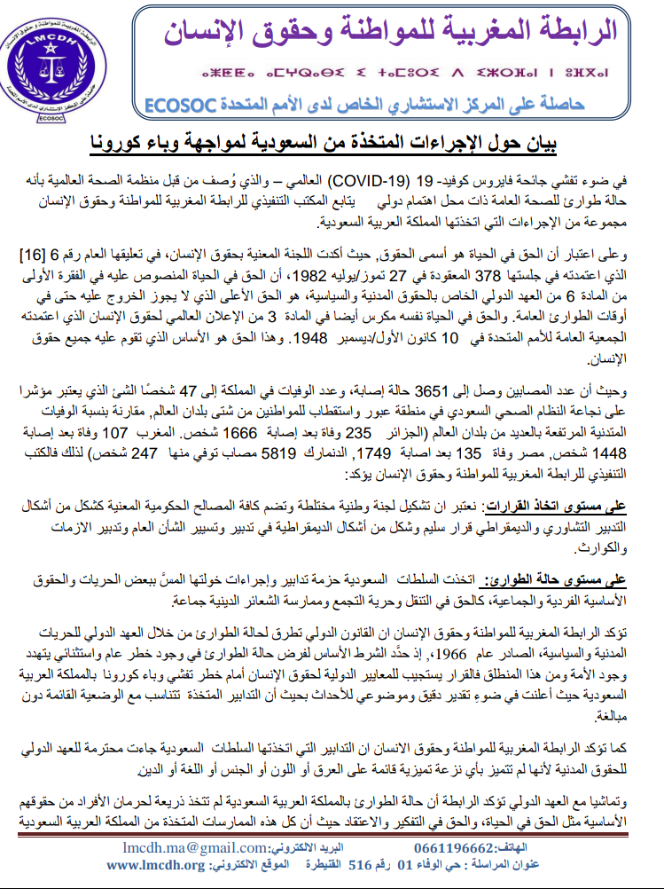 وحيث أن عدد المصابين وصل إلى 3651 حالة إصابة، وعدد الوفيات في المملكة إلى 47 شخصًا الشئ الذي يعتبر مؤشرا على نجاعة النظام الصحي السعودي في منطقة عبور واستقطاب للمواطنين من شتى بلدان العالم, مقارنة بنسبة الوفيات المتدنية المرتفعة بالعديد من بلدان العالم (الجزائر 235 وفاة بعد إصابة 1666 شخص. المغرب 107 وفاة بعد إصابة 1448 شخص, مصر وفاة 135 بعد اصابة 1749, الدنمارك 5819 مصاب توفي منها 247 شخص) لذلك فالكتب التنفيذي للرابطة المغربية للمواطنة وحقوق الإنسان يؤكد: