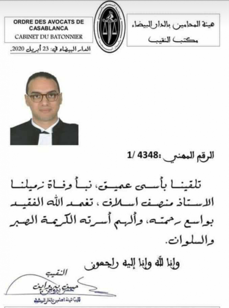 وقد نزل الخبر كالصاعقة على نقابة هيئة المحامين وعلى الأسرة القضائية ككل، حيث نعى نقيب هيئة المحامين بالدارالبيضاء “حسن بيرواين” وفاة الأستاذ الشاب منصف اسلاف، الذي خلف ألما كبيرا في نفوس زملائه.