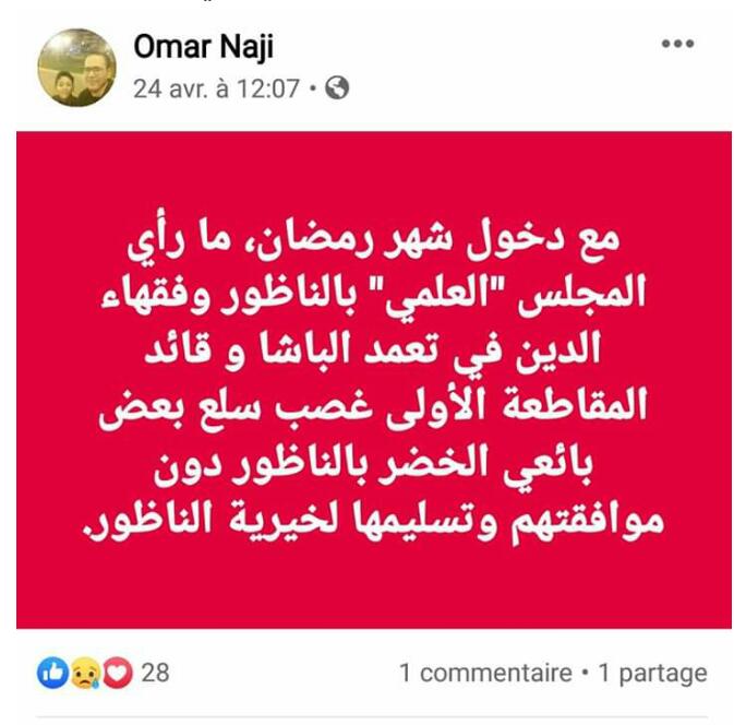 جاء في التدوينة ما يلي: ” مع دخول شهر رمضان، ما رأي المجلس “العلمي” بالناظور وفقهاء الدين في تعمد الباشا و قائد المقاطعة الأولى غصب سلع بعض بائعي الخضر بالناظور دون موافقتهم وتسليمها لخيرية الناظور.”