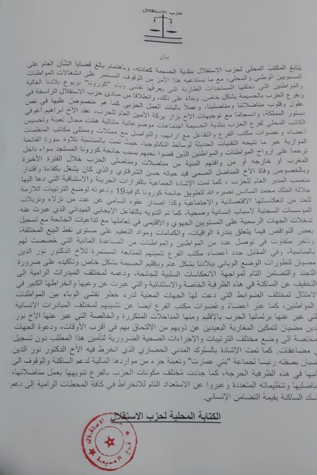 وبناءً على ذلك، وانطلاقا من مبادئ حزب الاستقلال الراسخة في عقول وقلوب مناضلاتنا ومناضلينا، وعملاً بآليات العمل الحزبي كما هو منصوصٌ عليها في نص دستور المملكة، وانسجامًا مع توجيهات الأخ نزار بركة الأمين العام للحزب، عقد الأخ ابراهيم أغوفي الكاتب المحلي لفرع الحزب ببلدية الحسيمة اجتماعات موضوعاتية متتالية همَّت مجال تعبئة وتحسيس أعضاء وعضوات مكتب الفرع والتفاعل مع آرائهم، والتواصل مع ممثلات وممثلي مكاتب المنظمات الموازية عبر ما تتيحه التقنيات الحديثة لوسائط التكنلوجيا.