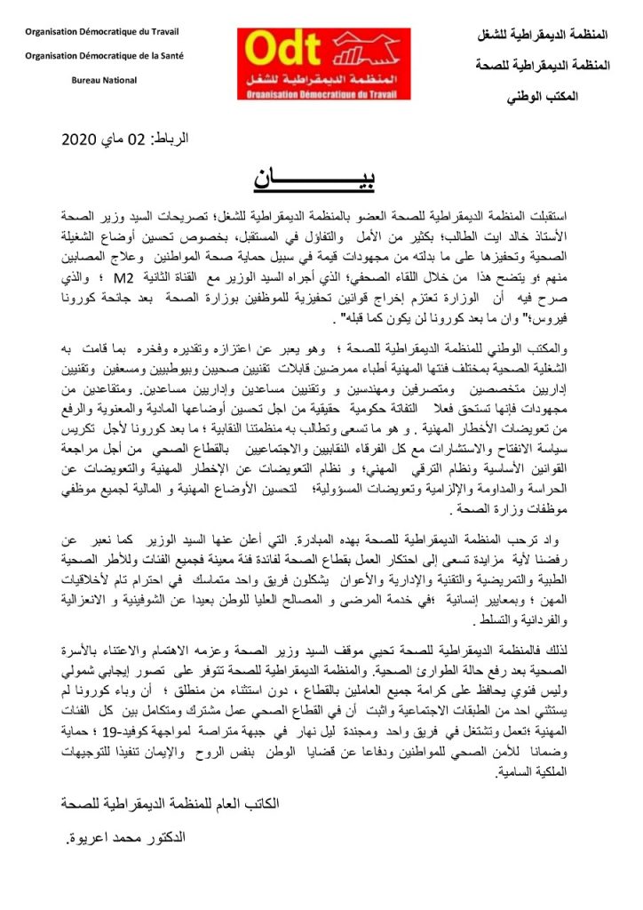 لذلك فالمنظمة الديمقراطية للصحة odt ، تحيي موقف وزير الصحة على اهتمامه بالاسرة الصحية بعد رفع حالة الطوارئ الصحية. والمنظمة الديمقراطية للصحة تتوفر على تصور إيجابي شمولي وليس فئوي يحافظ على كرامة جميع العاملين بالقطاع دون استثناء.