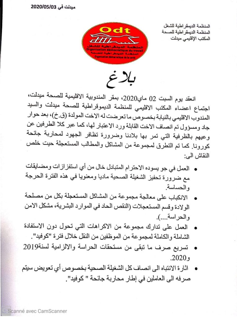 فقد تقرراجتماع اعضاء المكتب الاقليمي للمنظمة الديموقراطية للصحة ميدلت والسيد المندوب الاقليمي بالنيابة يوم السبت المنصرم لتسوية الوضع.