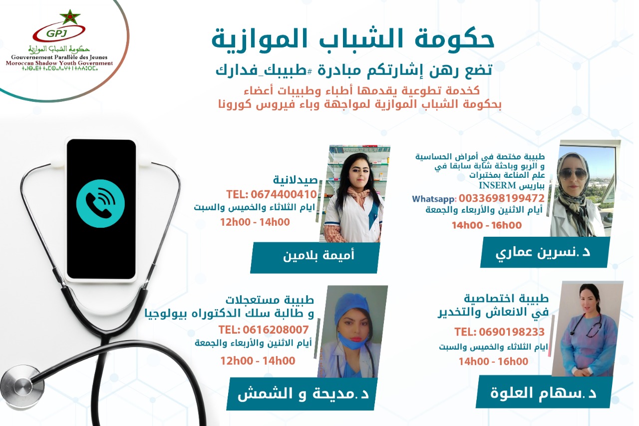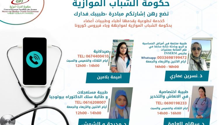 وفي هذا الإطار أطلقت حكومة الشباب الموازية مبادرة تحت شعار #طبيبكفدارك، لتقديم خدمات طبية، من أطباء وطبيبات أعضاء بالحكومة لصالح المواطنات والمواطنين.