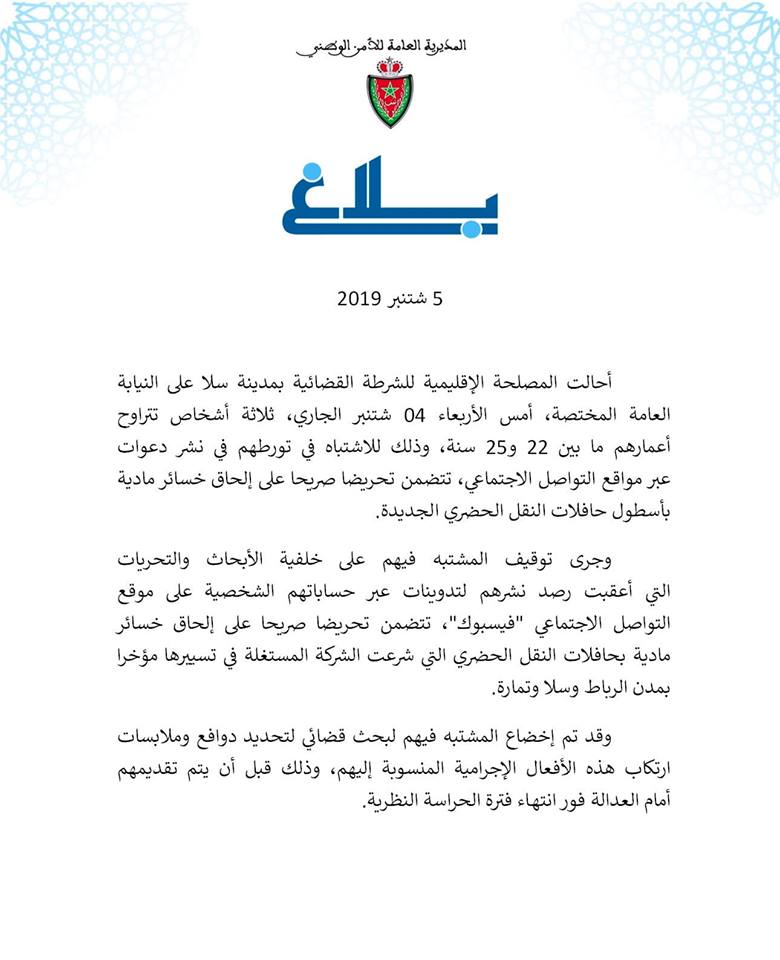 حسب بلاغ للمديرية العامة للأمن الوطني، تمت احالة ثلاثة أشخاص تتراوح اعمارهم ما بين 22 و 25 سنة، على النيابة العامة من طرف المصلحة الاقليمية للشرطة القضائية بسلا، وذلك للاشتباه في تورطهم في نشر دعوات عبر مواقع التواصل الإجتماعي، تتضمن تحريضا صريحا على إلحاق خسائر مادية بأسطول حافلات النقل الحضري الجديدة بمدن الرباط، سلا، وتمارة.